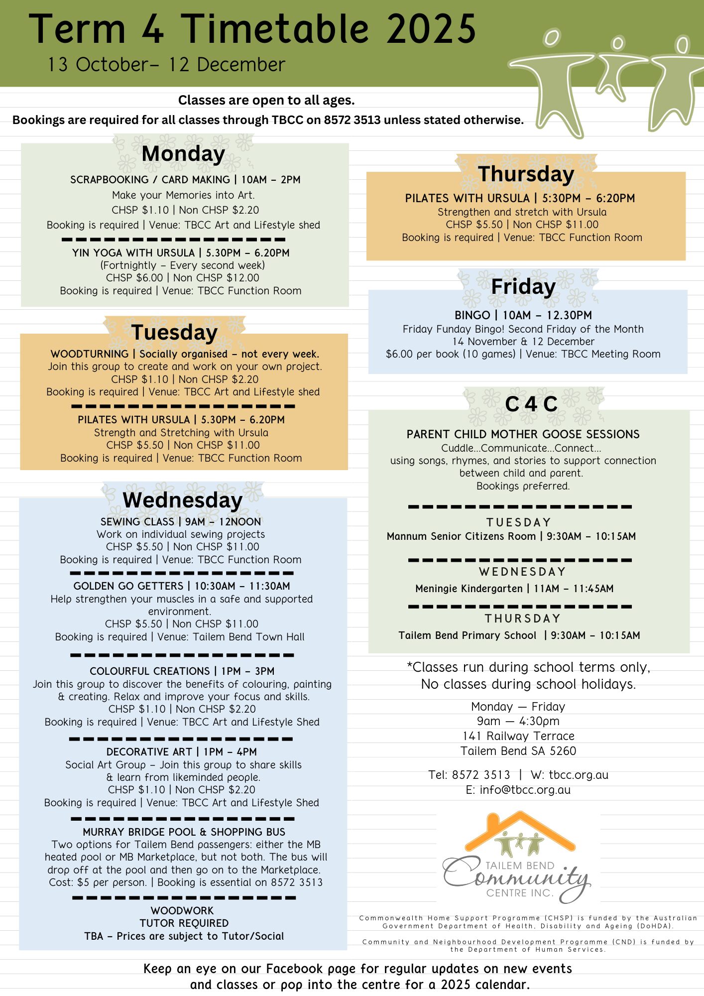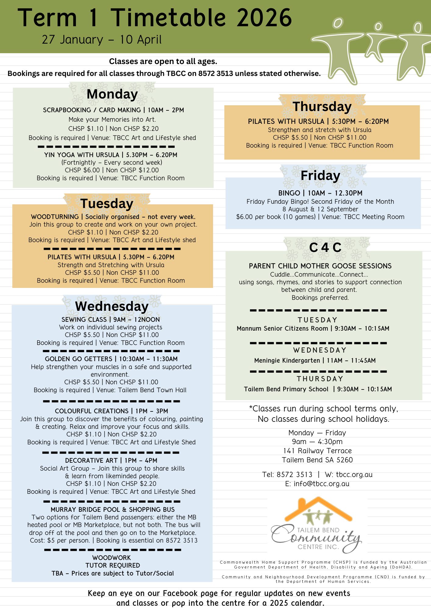 Timetable Timetable Please note that the Timetable is subject to change. We recommend contacting the Community Centre at 8572 3513 to confirm times and available spaces.